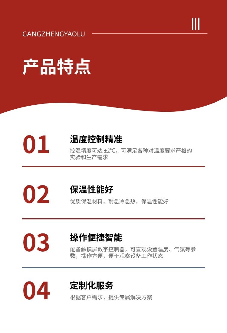 • 精準(zhǔn)控溫:配備***的 PID 智能溫控系統(tǒng),控溫精度可達(dá) ±1℃,能確保溫度的精準(zhǔn)控制,滿足科研實(shí)驗(yàn)和工業(yè)生產(chǎn)對(duì)溫度精度的要求。