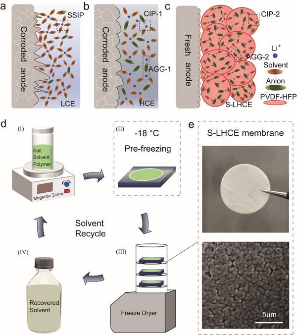 近日,中國科學院金屬研究所研究人員在前期聚合物電解質離子電導優化的基礎上(Angew. Chem. Int. Ed.2021,60,18448;Adv. Funct. Mater.2020,30,2007172.),提出了固化的局部高濃度電解質策略,通過解耦離子配對和離子傳輸,有效提高了電解質的離子電導率和電解質/電極間的界面兼容性,進而實現了可在寬溫度區間工作、具有優異快充/快放能力的固態鋰金屬電池。研究成果近期以Decoupling of ion pairing and ion conduction in ultrahigh-concentration electrolytes enables wide-temperature solid-state batteries為題發表于Energy&Environmental Science。