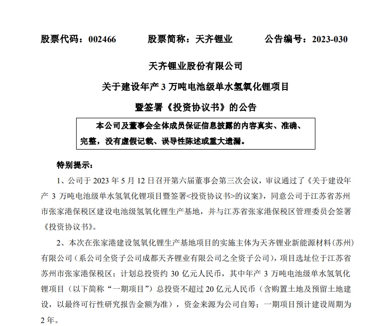 天齊鋰業5月12日公告,公司擬于江蘇省蘇州市張家港保稅區建設電池級氫氧化鋰生產基地,并與江蘇省張家港保稅區管理委員會簽署《投資協議書》。實施主體為孫公司天齊鋰業新能源材料(蘇州)有限公司,計劃總投資約30億元,其中年產3萬噸電池級單水氫氧化鋰項目(一期項目)總投資不超過20億元,資金來源為公司自籌;一期項目預計建設周期為2年。