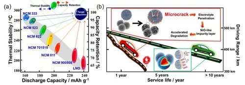 (a)不同鎳含量三元體系放電容量、熱穩定性和容量保持率的關系;(b)三元正極材料性能對電動汽車壽命的影響(來源:栗志展等,高鎳三元層狀鋰離子電池正極材料:研究進展、挑戰及改善策略)
