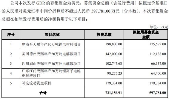 具體來看,天賜材料表示,募集資金總額在扣除發行費用后的凈額將用于以下項目:摩洛哥天賜年產30萬噸鋰電材料項目、美國德州天賜年產20萬噸電解液項目、四川眉山天賜年產30萬噸電解液項目、廣東江門天賜年產20萬噸鋰離子電池電解液項目及補充流動資金項目。