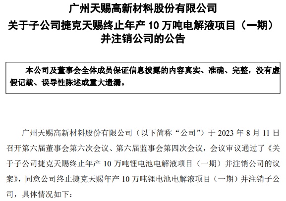 天賜材料表示,本次項目終止是基于公司項目的實際情況、外部環境因素等做出的審慎決定,符合公司的戰略發展規劃,不會影響公司電解液產品的出海計劃,不存在損害股東利益的情形;同時,注銷捷克天賜有利于優化公司資源及資產結構、降低公司管理成本、提高運營效率。注銷捷克天賜后,公司合并財務報表的范圍將相應發生變化,但不會對公司合并財務報表產生實質性的影響。