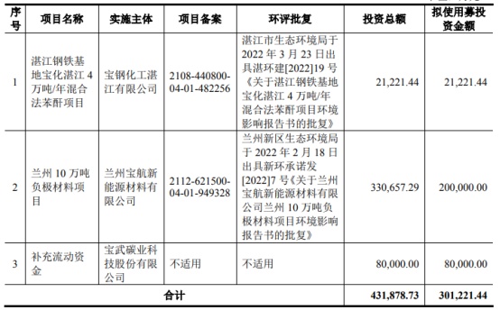 此次IPO,寶武碳業(yè)擬募資30.12億元,扣除發(fā)行費(fèi)用后計(jì)劃用于湛江鋼鐵基地寶化湛江4萬噸/年混合法苯酐項(xiàng)目、蘭州10萬噸負(fù)極材料項(xiàng)目和補(bǔ)充流動(dòng)資金。