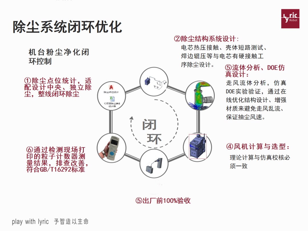 焊接和機構間的摩擦,讓電芯生產過程中產生粉塵,粉塵失控易造成電芯短路起火,因此長電芯生產過程中對車間作業有著嚴苛的潔凈度要求。利元亨創新采用內外部除塵結合的方式:內部采用AAF空氣過濾器配合除塵系統抽風換氣,對內部游離粉塵進行清潔,確保設備潔凈。外部嚴格控制粉塵的產生,避免使用有粉塵產生風險的機構與元器件,對產線各段設置粉塵監管點。并通過對關鍵因子的DOE設計,結合流體分析工具、3D增材制造等方法,得出最優的焊接口除塵方案,全方位無死角除塵。