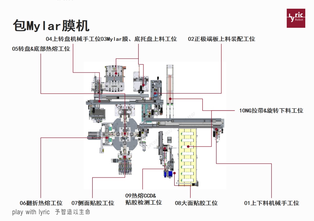 長期以來,長電芯的藍膜存在拉扯容易變形、包膜容易形成氣泡等難點,包膜機構成為長電芯組裝線的一大難題。在包膜工藝環節,利元亨取膜部分采用伺服+C5級直線模組驅動移位及備料循環等方式,最終攻克長電芯的包膜難題,精準包裹電芯。