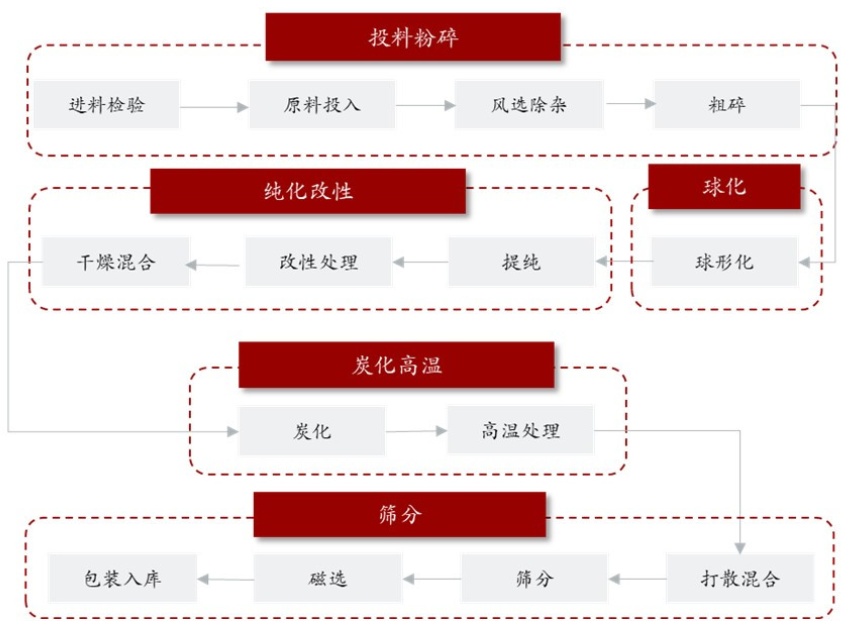 天然石墨負(fù)極原材料主要為鱗片石墨,其加工工藝主要包括球形化、改性處理、炭化高溫等。