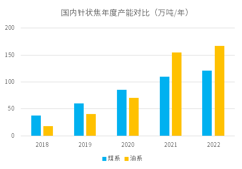 針狀焦起源于海外,存在一定技術(shù)壁壘,核心技術(shù)仍掌握在海外廠商手中。目前,國產(chǎn)針狀焦中低端產(chǎn)能偏多,中高端供應(yīng)嚴(yán)重不足。從數(shù)據(jù)上看,國內(nèi)針狀焦產(chǎn)能持續(xù)攀升,從2018年到2022年,復(fù)合增速率達52%。從2021年開始,油系針狀焦的產(chǎn)能超過煤系。