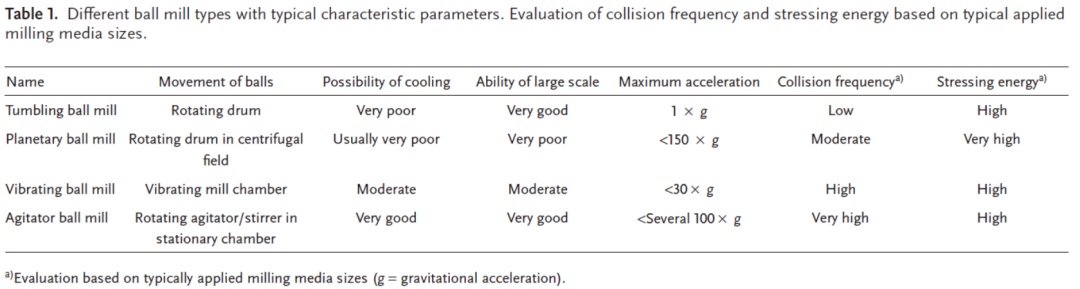 有多種可用于固體材料的機械化學合成和機械熔融的球磨機,根據球磨介質可分為以下四種:翻滾球磨機、行星球磨機、振動球磨機、攪拌球磨機。根據球磨的類型,傳遞到球磨介質的能量是不同的,從而產生應用于介質的不同的加速度與慣性力。不同球磨機的屬性如表1所示。