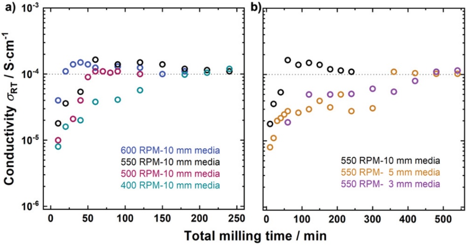 圖3a)盤轉速和b)磨礦介質尺寸對Na3PS4離子電導率的影響