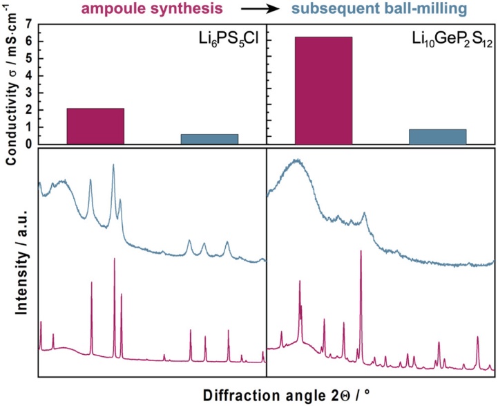 圖4高溫合成的和隨后球磨Li6PS5Cl和Li10GeP2S12的X射線衍射圖譜和離子電導率對比