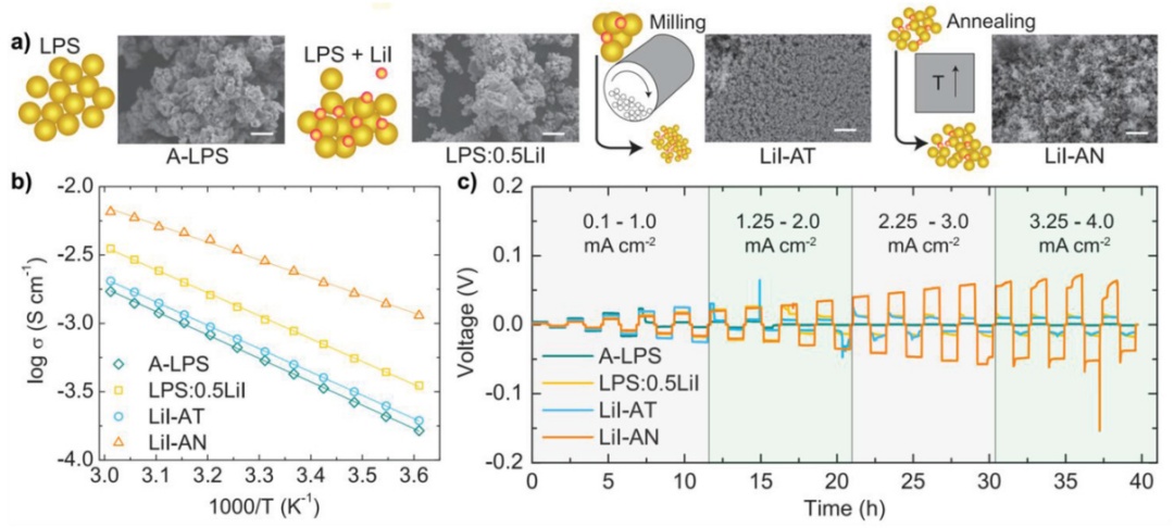 對鋰金屬電池隔膜材料的制備,球磨處理以及添加劑(如LiI,圖5)的加入都有利于離子的遷移,這與鋰離子擴散基質的致密化提高有關,其可以減少鋰離子堵塞孔隙的數量。