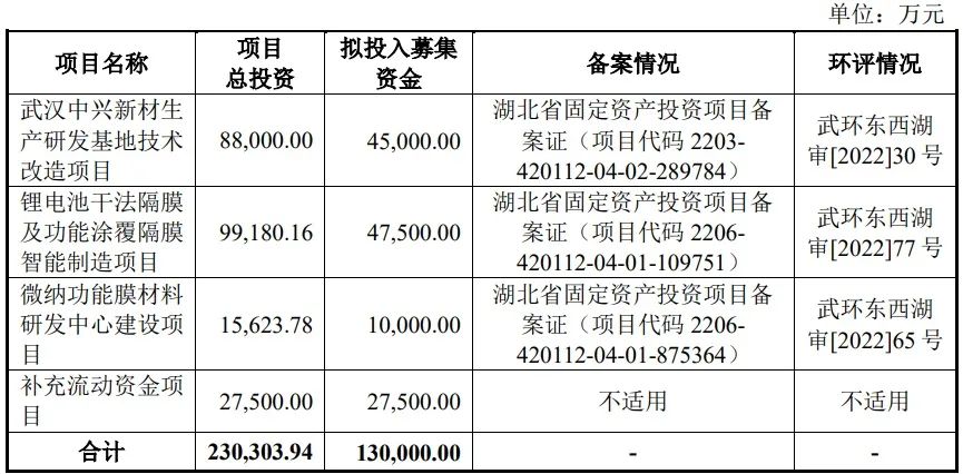 中興新材原擬在上交所科創板公開發行股份不超過31,941,385股,公司股東不公開發售股份,公開發行的新股不低于本次發行后總股本的25%。公司原擬募集資金130,000.00萬元,用于武漢中興新材生產研發基地技術改造項目、鋰電池干法隔膜及功能涂覆隔膜智能制造項目、微納功能膜材料研發中心建設項目、補充流動資金項目。