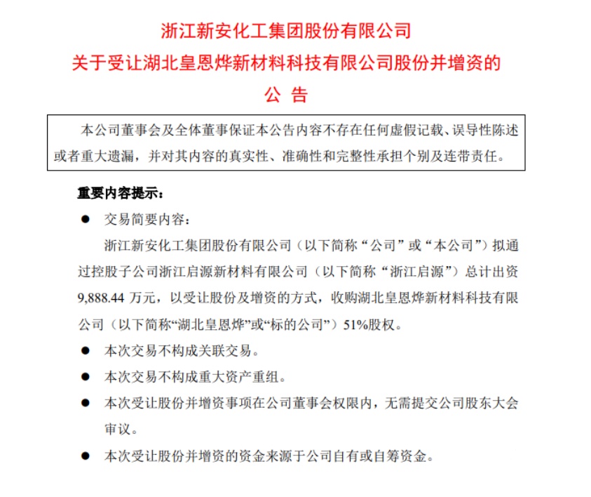 新安股份公布,擬通過控股子公司浙江啟源新材料有限公司總計出資9,888.44萬元,以受讓股份及增資的方式,收購湖北皇恩燁新材料科技有限公司(簡稱“湖北皇恩燁”)51%股權。
