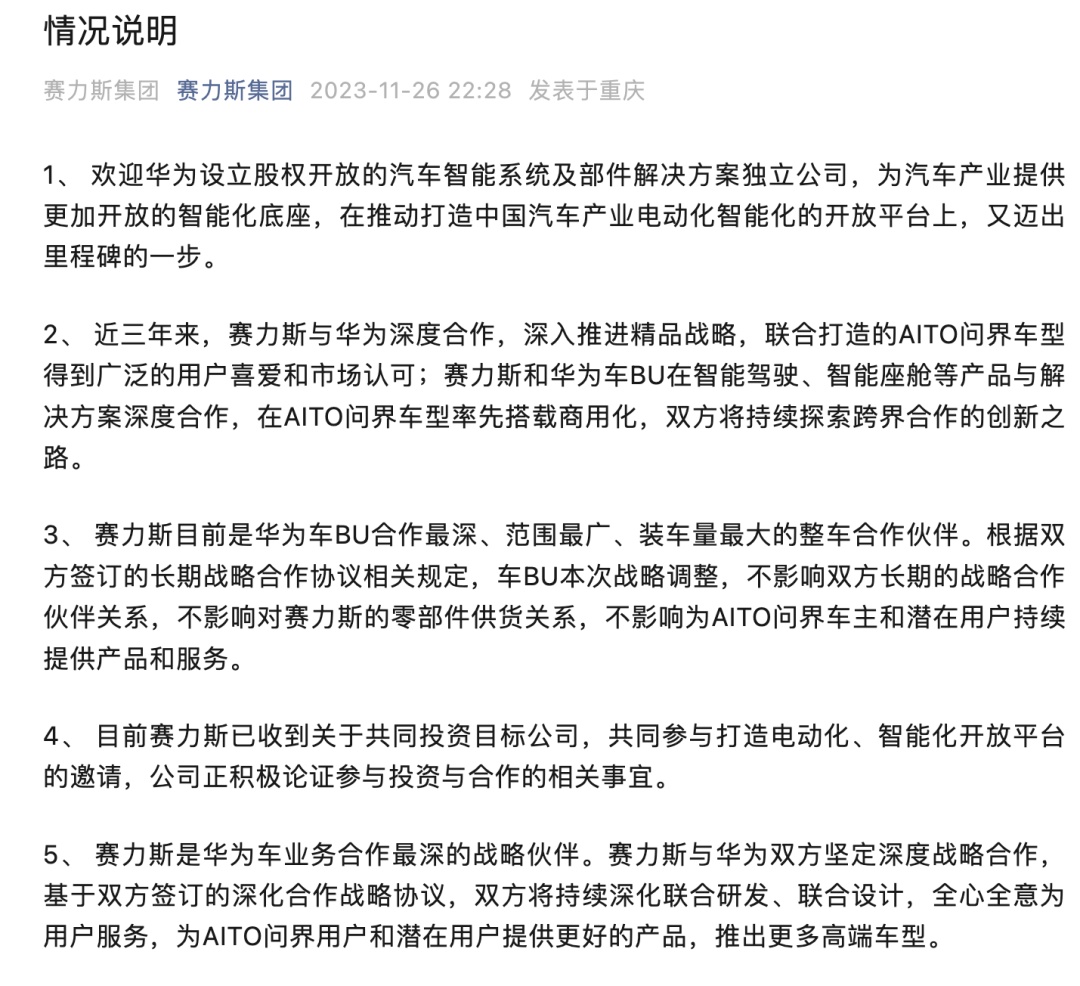 針對長安汽車與華為簽約,是否會影響到賽力斯的地位,賽力斯發(fā)布聲明稱,華為車BU本次戰(zhàn)略調(diào)整,不影響雙方長期的戰(zhàn)略合作伙伴關(guān)系,不影響對賽力斯的零部件供貨關(guān)系,不影響為AITO問界車主和潛在用戶持續(xù)提供產(chǎn)品和服務(wù)。目前賽力斯已收到關(guān)于共同投資目標(biāo)公司,共同參與打造電動化、智能化開放平臺的邀請,公司正積極論證參與投資與合作的相關(guān)事宜。