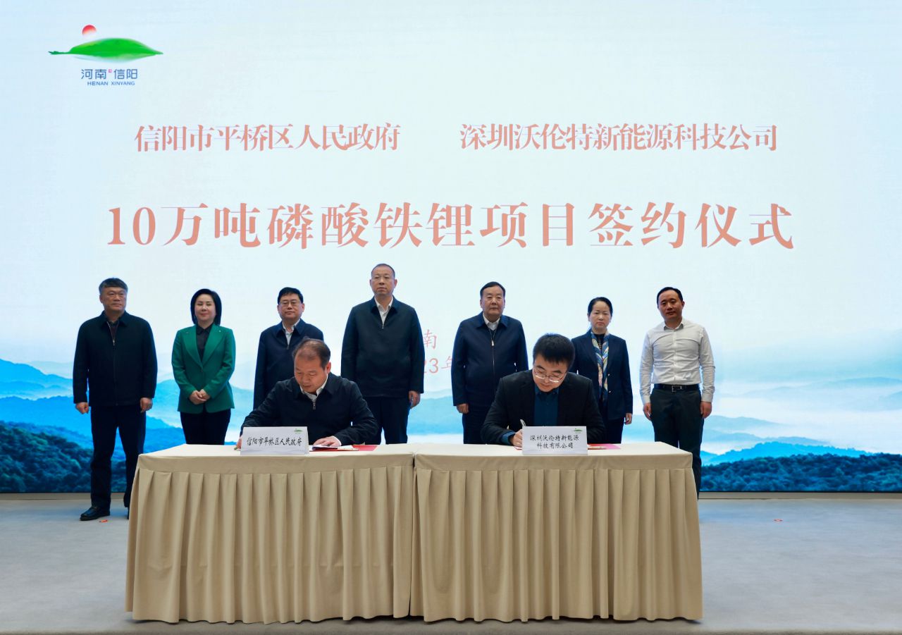 12月29日,信陽市平橋區(qū)人民政府與深圳沃倫特新能源科技有限公司10萬噸磷酸鐵鋰項(xiàng)目簽約儀式在信商之家舉行。