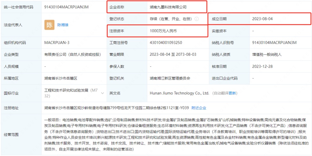 資料顯示,九墨科技是鋰電行業(yè)中的“新兵”,其成立于2023年8月4日,法定代表人陳湘雄,注冊(cè)資本1000萬(wàn)元人民幣,陳湘雄持股90%,劉金龍持股10%。