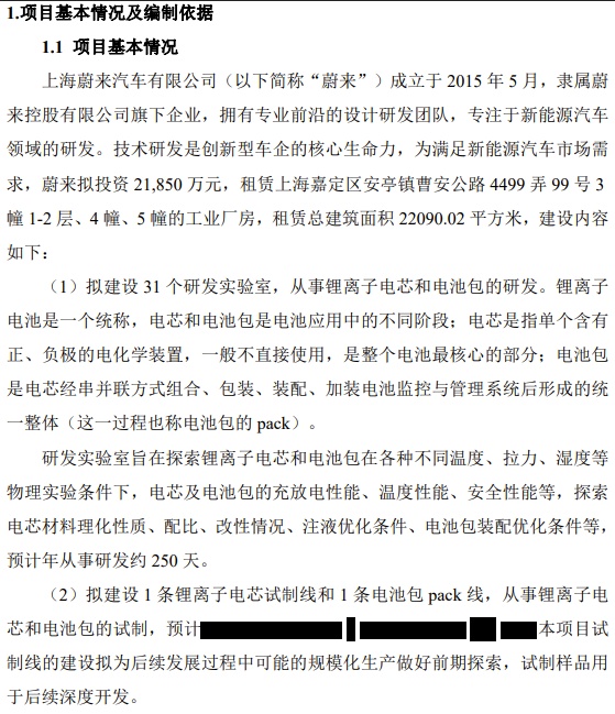 結(jié)合蔚來汽車提交的環(huán)評報告,該研發(fā)基地的總建筑面積達(dá)到22090.02平方米,施工期為2022年8月到10月,總投資金額達(dá)到2.185億元?;仡A(yù)計從事研發(fā)約250天,人員規(guī)模達(dá)到400余人。