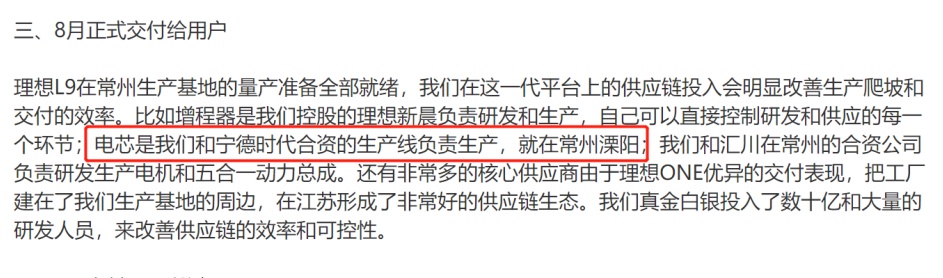 6月4日,理想汽車創(chuàng)始人李想在新浪微博上公布新車型L9相關(guān)消息時,提到其電芯將由位于常州溧陽的理想與寧德時代合資的電池生產(chǎn)線供應(yīng)。