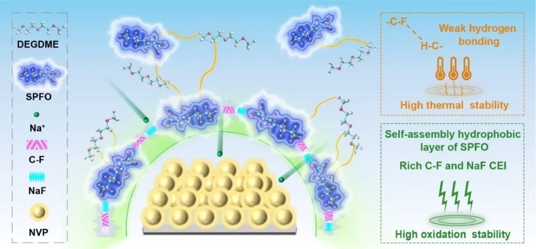 鈉離子電池具有資源豐富、成本低廉、性價比高等優(yōu)勢,在中低速電動車和大規(guī)模儲能等領(lǐng)域應(yīng)用前景廣闊。醚類電解液因其低熔點和高電導(dǎo)性等優(yōu)勢成為鈉離子電池相適配的優(yōu)選電解液體系之一。但是,醚類電解液較高的最高占據(jù)分子軌道能級(HOMO)使其固有抗氧化性不足,當電池電壓超過4.0V(vs.Na/Na+)時,會發(fā)生劇烈氧化分解,難以形成穩(wěn)定可靠的電極/電解液界面(CEI),造成嚴重的不可逆容量損失和較差的電化學穩(wěn)定性,因此無法有效應(yīng)用于電壓較高的正極材料體系。同時,醚類電解液的低閃點和易燃性增加了其高溫下的熱失控風險,也限制了其在鈉離子電池中的普適性應(yīng)用。
