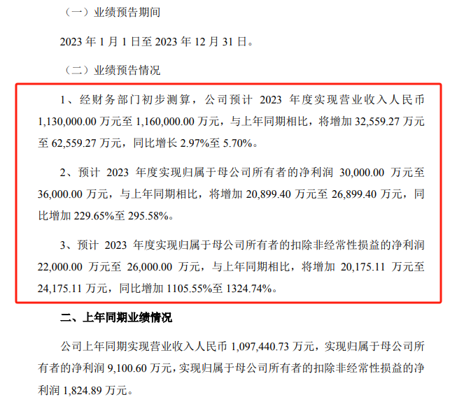 財報顯示,2023年實現扣非凈利潤約為2.2億元-2.6億元,同比增加1105.55%-1324.74%。