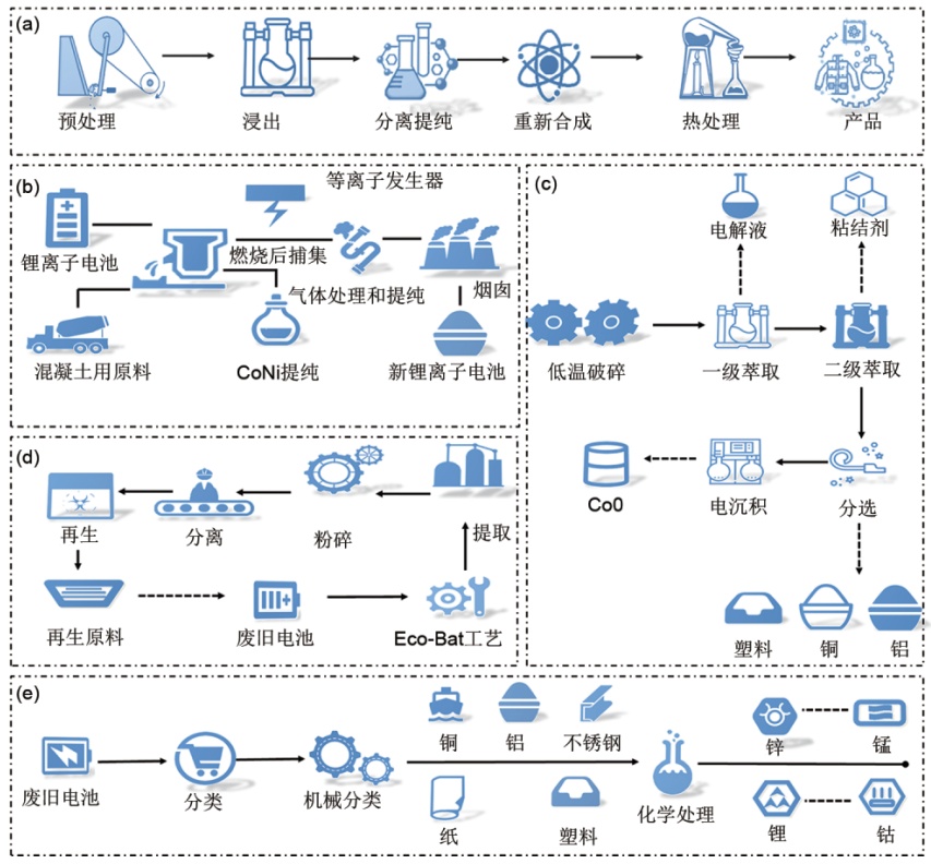 國內(nèi)外企業(yè)回收鋰電池電解液案例:(a)格林美工藝;(b)比利時(shí)Umicore工藝;(c)英國AEA工藝;(d)日本OnTo工藝;(e)法國Recupyl工藝