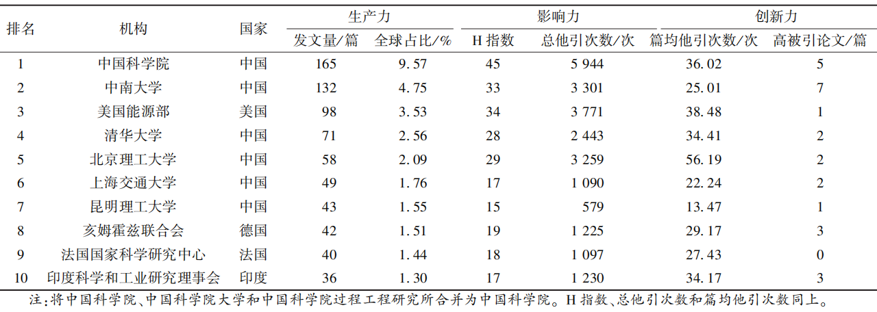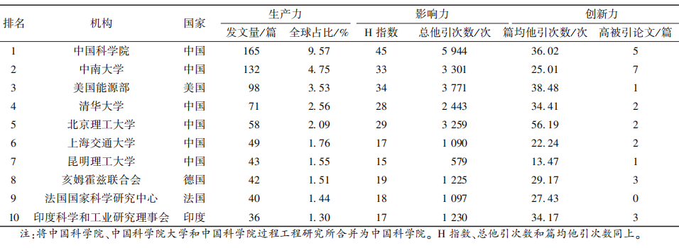 影響力方面,以H指數(shù)、總他引次數(shù)和篇均他引次數(shù)為衡量指標(biāo),結(jié)果顯示:中國科學(xué)院、中南大學(xué)和美國能源部居H指數(shù)和總他引次數(shù)的前三位;北京理工大學(xué)、中國科學(xué)院和美國能源部位列篇均他引次數(shù)前三位。