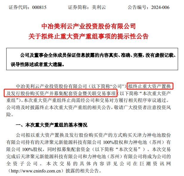 2月4日,美利云宣布擬終止跨界重組布局鋰電池。該公司表示,綜合近期市場環境變化等因素影響,交易各方認為現階段繼續推進本次重大資產重組事項不確定性較大,因此擬協商終止重組事項。