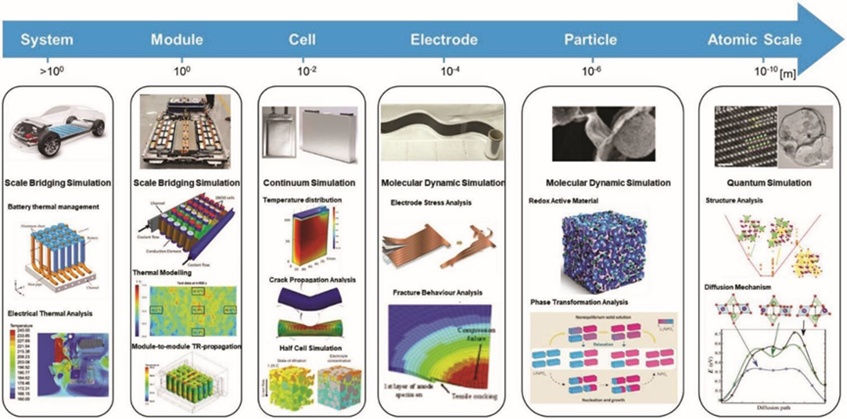 當前電池仿真技術主要的發展趨勢為多尺度仿真。多尺度仿真即跨越微宏觀多個尺度,在電池材料本征特性(微觀原子、分子層面)、活性材料顆粒、極片、電芯以及電池模組、電池包多個尺度上進行仿真模擬和設計優化。