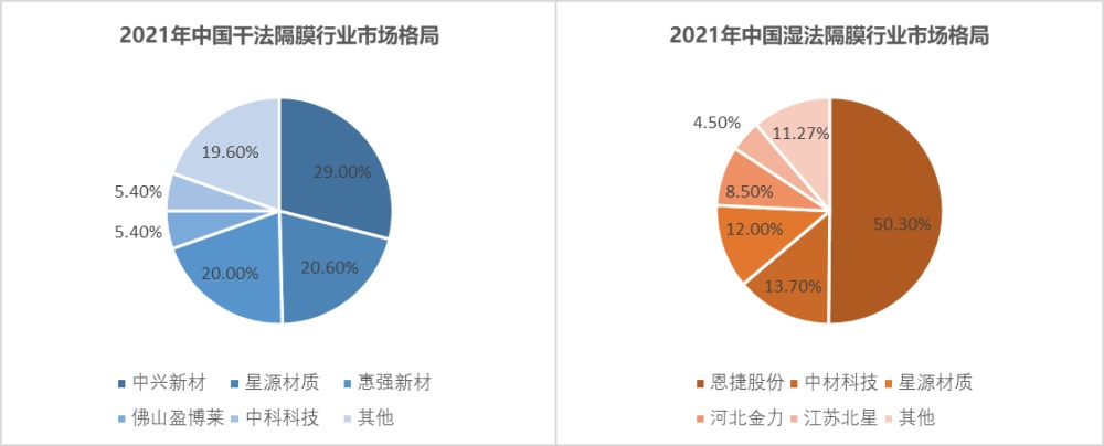 隔膜作為動力電池的重要組成成分,其發展受到動力電池以及新能源汽車發展路線的影響。隨著動力電池對能量密度需求的不斷提升,濕法隔膜因其性能優勢受到更多的市場認可,產能及出貨量占比也在顯著提升。目前國內第一梯隊隔膜供應商恩捷股份、星源材質、中材科技等均大力加碼濕法隔膜,力圖擴大競爭優勢。而基于重技術、重資金、重規模的特點,在沒有出現重大變革的前提下,隔膜行業將持續呈現強者恒強的格局。
