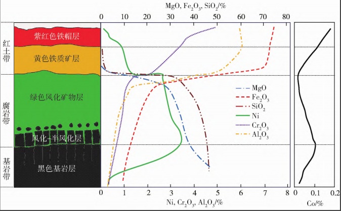(1)紅土帶:上部為紫紅色鐵帽層,出現(xiàn)大量膠結(jié)成粘粒狀或團塊狀的鐵氧化物,主要礦物有褐鐵礦、赤鐵礦以及少量的次生石英和高嶺土等。中下部為疏松多孔狀的發(fā)育黃色鐵質(zhì)礦層,主要礦物有針鐵礦、褐鐵礦以及少量基巖的風化殘留碎塊。紅土帶整體上主要由褐鐵礦組成,具有高鐵低鎂的特點。