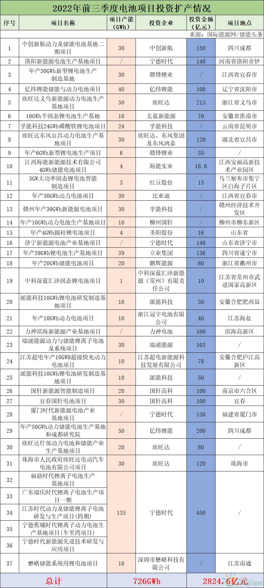 進入2022年之后,國內電池新能源產業鏈企業擴產、簽約的利好消息接連不斷。據國際能源網/儲能頭條不完全統計不完全統計,2022年前三季度,以比亞迪、欣旺達、中創新航、億緯鋰能等為代表的鋰電池企業相繼公布了多個新投建項目,整體投建資金超2824.6億元,建設年產能達726GWh(部分項目未披露投資金額及產能),較去年同期相比擴產步伐進一步加速。