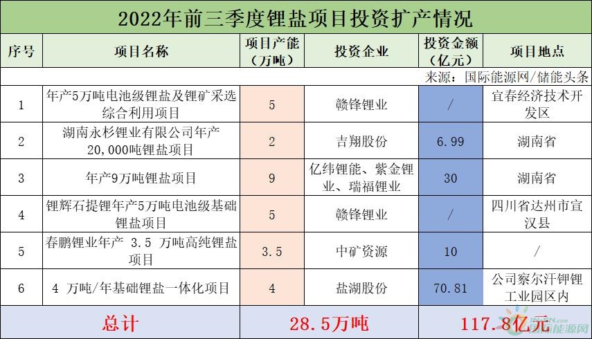 據國際能源網/儲能頭條(微信號:chuneng365)統計,贛鋒鋰業、吉翔股份、億緯鋰能、紫金鋰業、瑞福鋰業等企業規劃了或者簽署了28.5萬噸的鋰鹽項目。