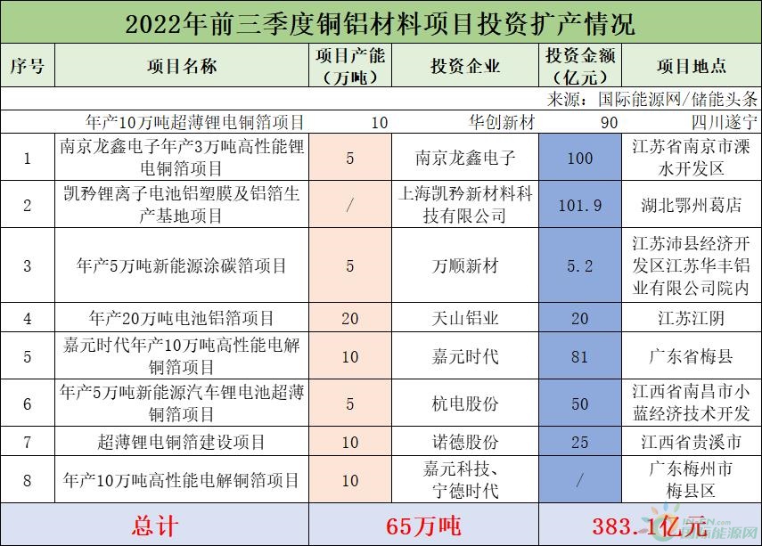 加大產能擴張是當前鋰電銅箔廠商競相追逐的重點。寧德時代、嘉元科技、杭電股份、天山鋁業、諾德股份等企業紛紛開啟銅鋁材料擴產模式,合計推出了65萬噸的擴產計劃。