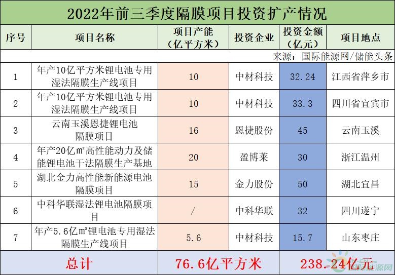 2022年前三季度,中材科技在江西萍鄉、四川宜賓分被投資建設年產10億平方米鋰電池隔膜項目。項目計劃總投資65.54億元,規劃建設年產能20億平方米的鋰離子電池基膜生產線及涂覆膜生產線。其中,中材鋰膜(西南)基地年產10億平方米鋰電池隔膜項目已于近日正式啟動,該項目預計2023年6月開始投產。項目建成后,預計年產值約20億元。