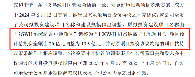 公告顯示,高樂股份原擬投資建設項目名稱由“2GWh納米固態電池項目”調整為“1.2GWh固態鈉離子電池項目”,項目預計總投資金額由20億元調整為10.5億元。包括固定資產投資6.7億元(含裝修費用),流動資金3.8億元,并對原項目投資協議約定的項目扶持政策條款作出相應調整。