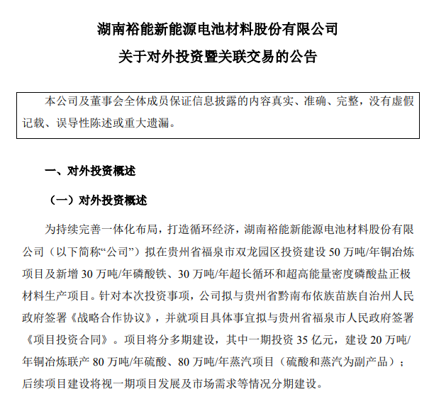 6月28日,湖南裕能公告,擬在貴州省福泉市雙龍園區投資建設50萬噸/年銅冶煉項目及新增30萬噸/年磷酸鐵、30萬噸/年超長循環和超高能量密度磷酸鹽正極材料生產項目。