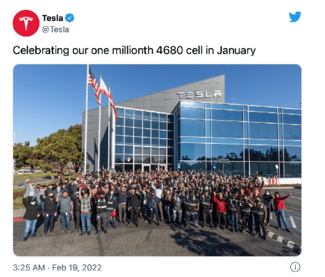 2022年2月19日,特斯拉發布信息,慶祝第100萬個4680電池下線。