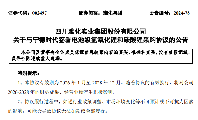 繼6月份與特斯拉簽署三年的碳酸鋰采購協(xié)議后,9月4日晚間,雅化集團(tuán)公告稱,公司全資子公司雅化鋰業(yè)(雅安)有限公司(以下簡(jiǎn)稱雅安鋰業(yè))與寧德時(shí)代簽訂采購協(xié)議,寧德時(shí)代將從2026年1月至2028年12月,向雅安鋰業(yè)采購電池級(jí)氫氧化鋰和碳酸鋰產(chǎn)品。