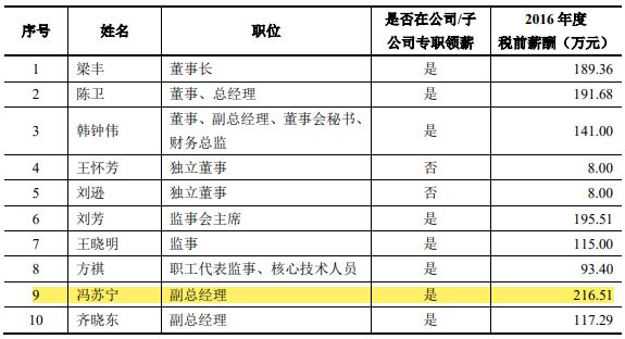 2016年璞泰來高管薪資,圖源:璞泰來招股書