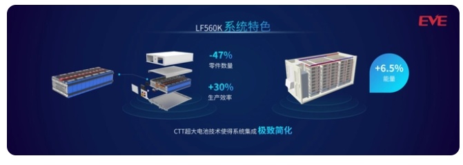 在系統(tǒng)集成的應用中,相較于LF280K電池,使用LF560K電池可減少電芯數(shù)量50%、簡化Pack零部件數(shù)量47%,提升生產(chǎn)效率30%。此外,通過簇級別尺寸的優(yōu)化,可提高集裝箱電量6.5%,適配行業(yè)標準集成方案,降低客戶使用成本。