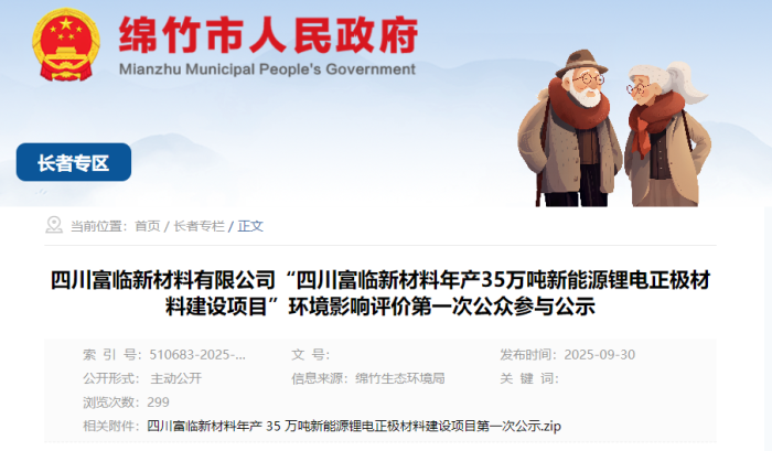 中國粉體網訊 近日,綿竹市政府發布四川富臨新材料有限公司“四川富臨新材料年產35萬噸新能源鋰電正極材料建設項目”環境影響評價第一次公眾參與公示。