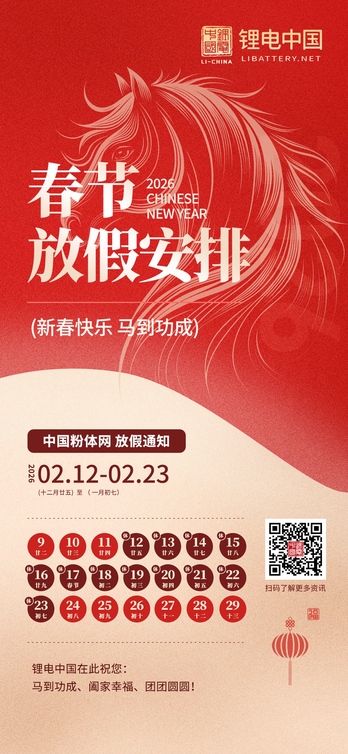2026年2月12日至2月23日,鋰電中國全體員工放假,網站在此期間將暫停信息更新和相關服務。2月24日開始正常上班,各項服務恢復正常。