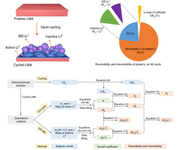 以金屬鋰為負極的鋰金屬二次電池具備超越600Wh/kg能量密度的潛力,是突破傳統鋰離子電池能量密度極限的下一代高比能電池技術發展方向和研究熱點。然而,金屬鋰負極電化學可逆性差成為制約鋰金屬電池循環壽命提升的瓶頸。準確分析金屬鋰負極的可逆性是剖析其性能衰減機制,進而發展長壽命鋰金屬電池的關鍵基礎科學問題。不同于傳統鋰離子電池可以用庫倫效率來直接反映電化學反應可逆性,鋰負極中預先存在的金屬鋰在鋰電池循環過程中持續補償不可逆鋰損失,鋰負極的真實可逆程度無法通過現有技術手段獲知,因而建立金屬鋰負極可逆性的定量分析方法是鋰金屬二次電池研究亟需解決的關鍵科學問題。