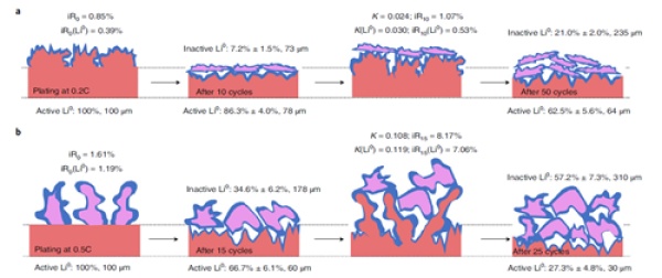 圖3.應用本研究工作所發展的定量分析方法并結合形貌表征,繪制的在C/5(a)和C/2(b)不同倍率充放電循環過程中金屬鋰負極結構演化示意圖