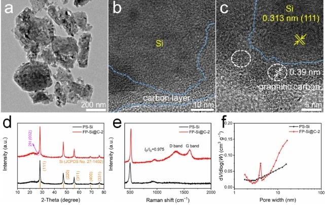 圖1.FP-Si@C-2復合材料的物性表征:(a)TEM圖片;(b,c)HRTEM圖片;(d)XRD譜圖;(e)Raman譜圖;(f)孔徑分布。