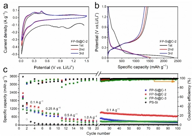 圖2.FP-Si@C-2復合負極在半電池中的儲鋰性能:(a)前三周的CV曲線(掃速為0.1mVs-1);(b)前三周的GCD曲線(電流密度為0.1Ag-1);(c)倍率性能和循環穩定性。