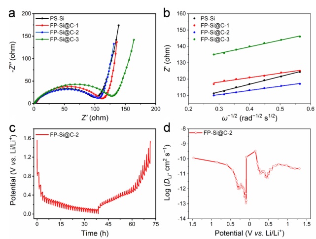 圖3.FP-Si@C-2復合負極的動力學分析:(a)EIS譜圖;(b)Z′和ω-1/2的擬合曲線;(c)GITT曲線;(d)Li+擴散系數。