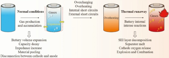圖1.不同條件下的氣體生成過程及其對電池性能和安全性的影響。