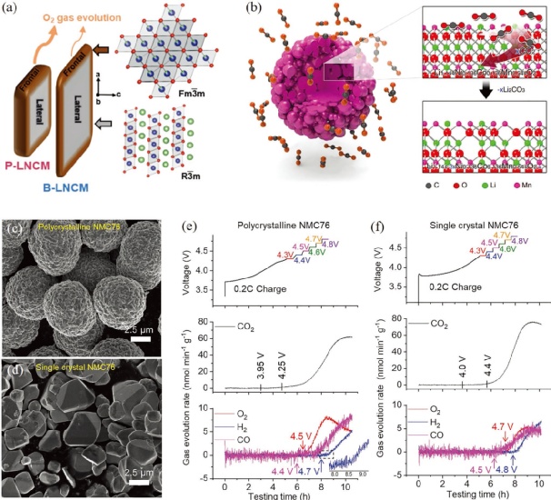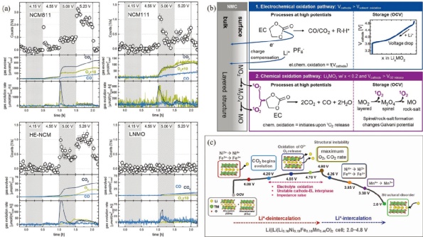 正極材料是是電池容量的貢獻者,但也是一塊短板,它決定了鋰電池的能量密度。正極側的氣體生成是電池氣體的重要來源,特別是在熱失控條件下,氣體將不斷產生,同時其他組分產生的氣體也會進入電池,帶來嚴重的安全風險。本章節從正極材料表面殘留雜質、正極材料本身、與電解質的界面反應、熱失控條件下以及電極其他組分等方面對電池產氣的貢獻進行詳細地分析和總結。
