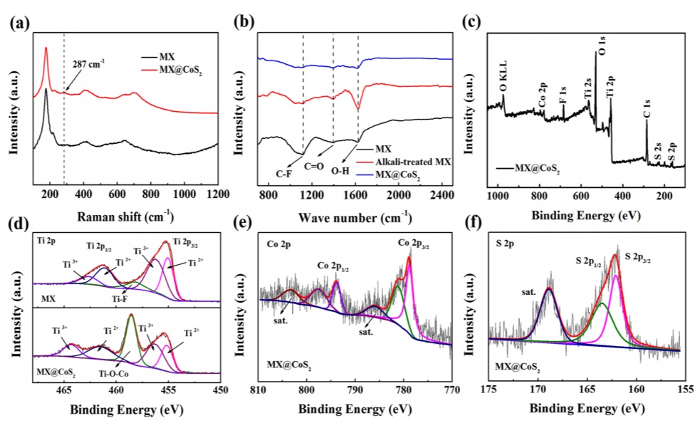 圖2a拉曼光譜。bMX和MX@CoS2的FT-IR光譜。cMX@CoS2的XPS測量光譜。MX和MX@CoS2的dXPSTi2p譜。MX@CoS2的eXPSCo2p和fXPSS2p譜。@TheAuthors